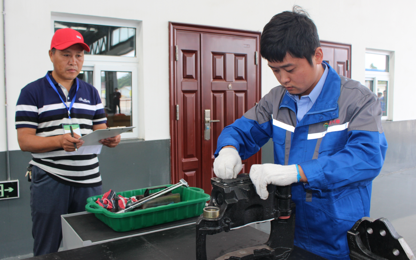 比賽開始了!參賽選手們穿戴整齊的工作服,個個卯足了勁,整裝待發(fā)。整潔的維修車間兩個工作臺上,四組修理人員同時進行盤式制動器拆裝組合的項目比賽,四名裁判員認(rèn)真對照標(biāo)準(zhǔn)計分,現(xiàn)場安靜得只聽見制動器拆裝時輕微的“啪啪”聲。一旁的4個檢修地溝上,分別停著4輛新能源純電動公交車,同時進行著新能源車電控故障排除項目的比賽。參賽人員時而在駕駛室時而在車廂尾部檢修電路,裁判員根據(jù)實際操作隨機提問、記錄。